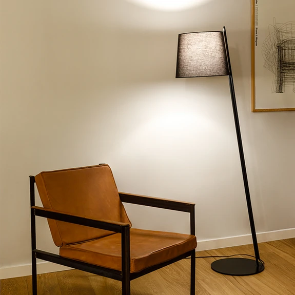 Als wohnlicher Lichtspender bereichert die Stehlampe Clip das Wohn- oder Schlafzimmer. Der Lampenschirm in der Form eines Kegelstumpfs ist aus Textil gearbeitet; das Gewebe lässt das Licht des einzusetzenden Leuchtmittels sanft nach außen strahlen. Das schwarze, aus Stahl gefertigte Gestell setzt sich aus einem hohen, leicht nach vorn geneigten Ständer und einer flachen, runden Fußplatte zusammen.