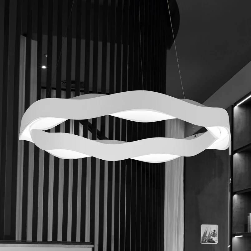 Diese Hängeleuchte weckt durch die aparte Form des ringförmigen Schirmelements Assoziationen mit den Wellen des Meeres. Der wellenförmige Ring bietet eine hervorragende Plattform für das abstrahlende Licht der verbauten LEDs. Ihr Licht fließt wie ein sanfter Strom durch den Raum. Ideal als Allgemein- und Tischbeleuchtung im Wohnzimmer, als Foyerbeleuchtung im Hotel und als Lichtspender für viele andere öffentliche Räume. Die Helligkeit des Lichts lässt sich über einen extern vorhandenen Phasenanschnittdimmer regulieren. Ein elektronisches Vorschaltgerät ist enthalten.