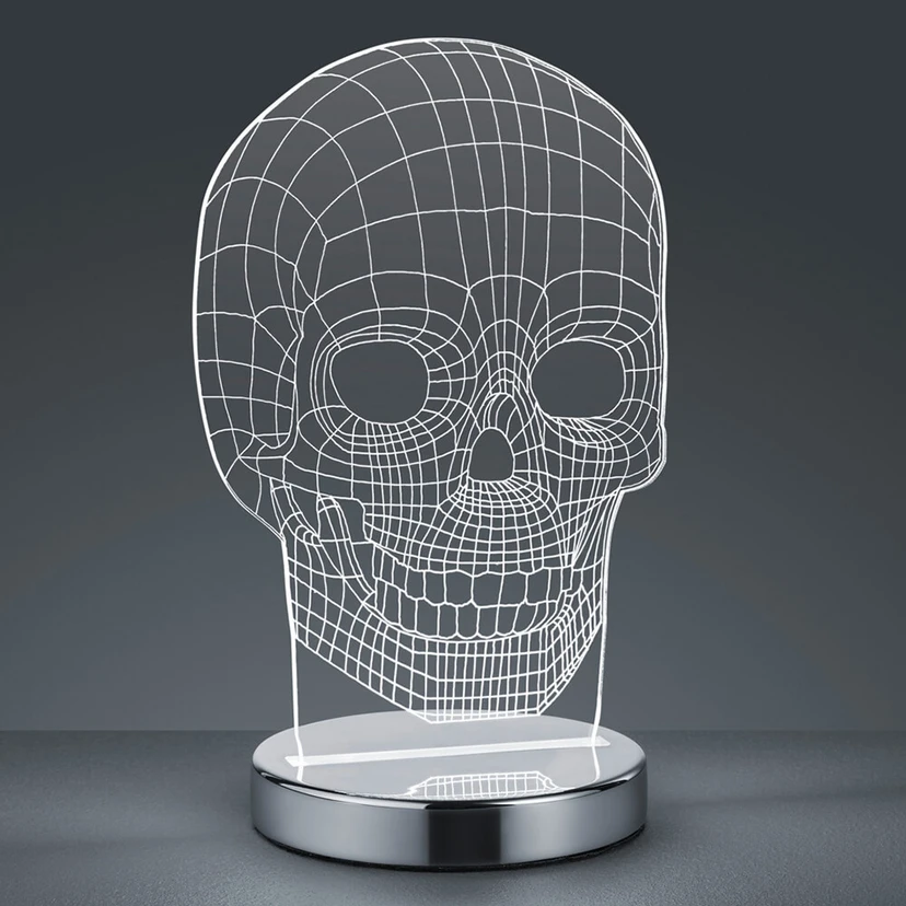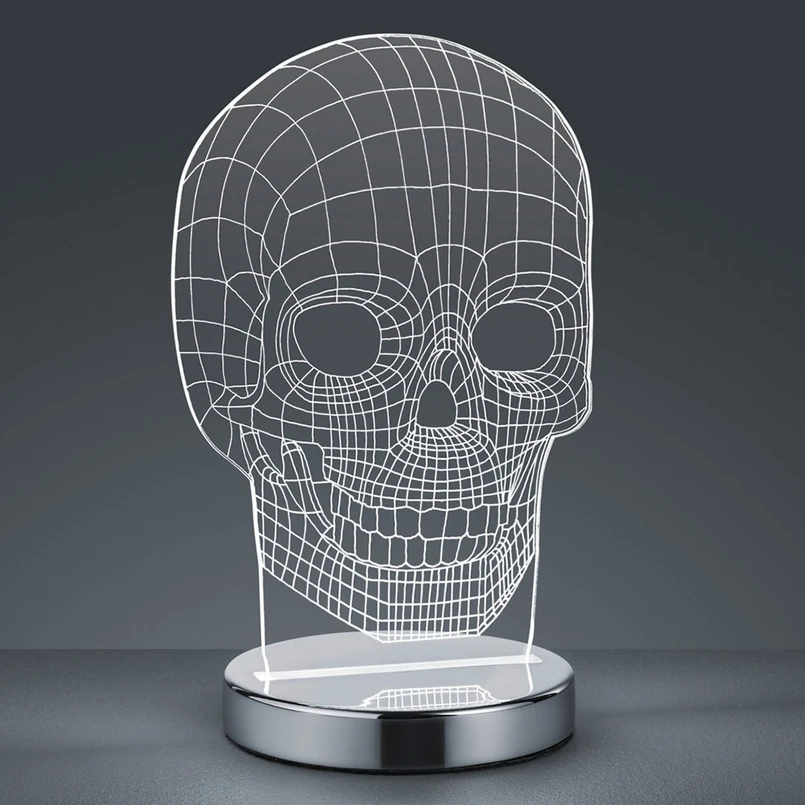 In angesagtem Totenkopf-Design: LED-Tischleuchte Skull mit 3D-Hologramm-Effekt Mit der LED-Tischleuchte Skull lassen sich einmalige Lichtmomente im Kinder-, im Jugend- oder im Wohnzimmer erzeugen. Dies wird durch den aus Acryl gefertigten Leuchtenschirm ermöglicht, der in eingeschaltetem Zustand ein 3D-Hologramm eines Totenkopfes entstehen lässt. Als besonderer Clou lässt sich die im chromglänzenden, runden Leuchtenfuß verbaute LED-Lichttechnik nach Belieben in der Lichtfarbe verstellen, um die Lichtwirkung auf die eigenen Bedürfnisse anpassen zu können. Neben der Lichtfarbe Warmweiß stehen noch die beiden Lichtfarben Universalweiß und Tageslicht zur Verfügung.
