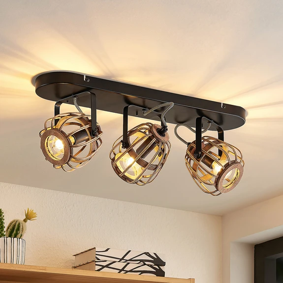 Der Deckenstrahler Bominio überzeugt mit seiner stilvollen Materialkombination aus schwarzem Stahl und hellem Rattan, die sehr gut miteinander harmonieren, sodass die Leuchte auch im ausgeschalteten Zustand ein echter Hingucker an der Decke ist. Die Schirme besitzen dünne Streben, die einen beinahe freien Blick auf die Brennstellen gewähren. Deshalb sollten die einzusetzenden Leuchtmittel eher dekorativ ausfallen, um den besonderen Look dieser Leuchte zu untermalen.