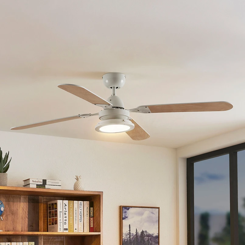 LED-Deckenventilator Tedric aus MDF in Buchenoptik und Stahl mit Fernbedienung