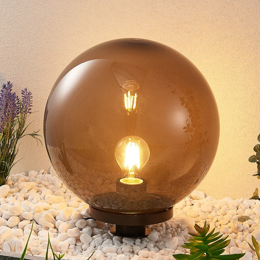 Deko-Kugelleuchte Samini in rauchgrauer Optik und mit einem praktischen Erdspieß