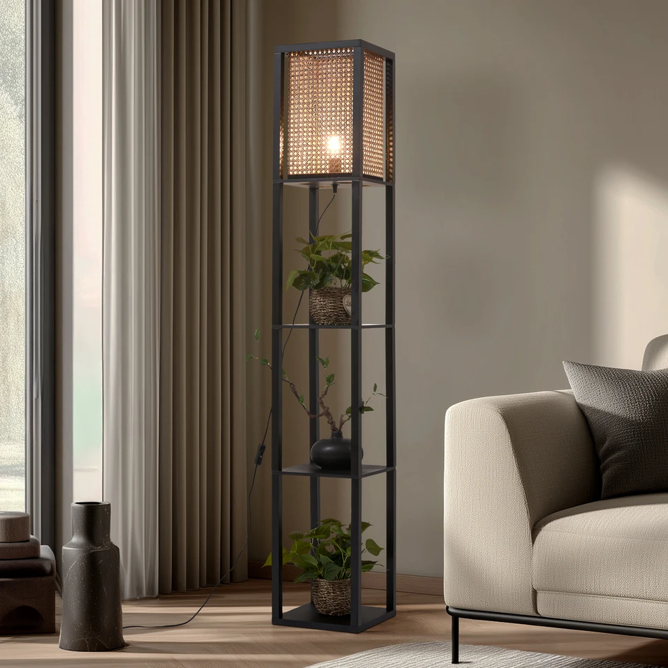 Lindby Stehleuchte Birta, schwarz/natur, Regal, Rattan