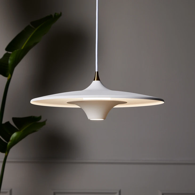 Moja ist eine schöne und schlichte Pendelleuchte, die für eine moderne Einrichtung geschaffen wurde. Die Pendelleuchte hat einen schönen Aluminiumschirm, der mit einer Messingplatte und einer Stoffschnur ergänzt wird - das Ergebnis ist ein stilvoller und eleganter Ausdruck.