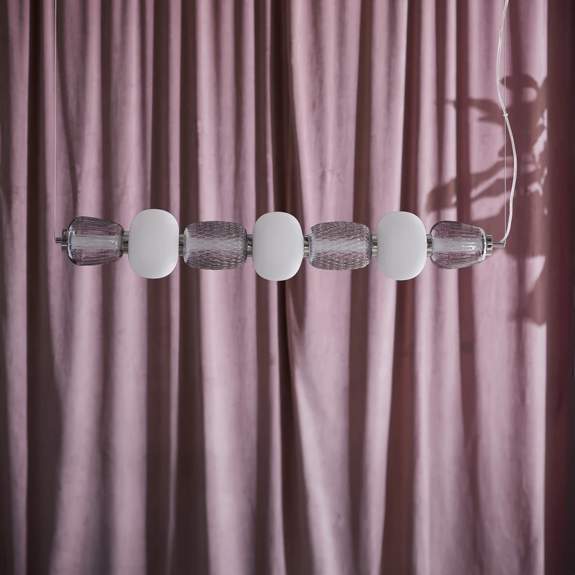 Horizontale LED-Pendelleuchte Pearl 7 mit opalen und getönten Gläsern sowie metallischen Details
