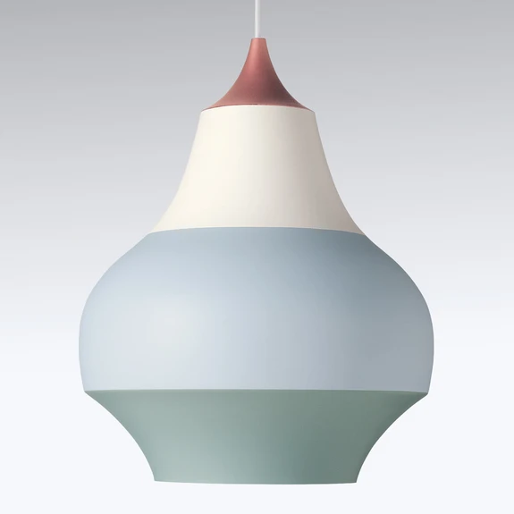 Der farbig unterteilte Schirm wurde aus Aluminium gefertigt und ist innen mit einer weiß lackierten Reflexionsfläche ausgestattet. So entsteht ein sehr angenehmes, blendfreies Umgebungslicht, das nach unten abgestrahlt wird.