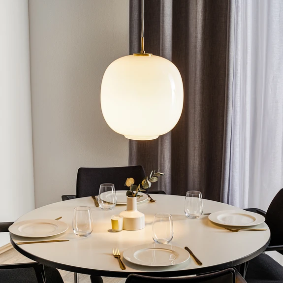 Die Hängeleuchte VL45 Radiohus - ein Designobjekt von Vilhelm Lauritzen - besticht mit ihrem wunderschönen Schirm aus mundgeblasenem Opalglas, der eine weiche und gleichmäßige Lichtabstrahlung bewirkt. Durch die Öffnung am Boden wird das Licht sehr konzentriert nach unten gerichtet, außerdem erzeugt die Beschaffenheit des Glases eine gleichmäßige Beleuchtung der Leuchtenoberfläche.