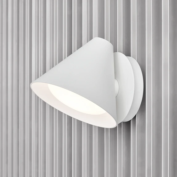 Die LED-Wandleuchte Keglen präsentiert sich im selben Design wie die Pendelleuchte der Serie. Der kegelförmige Schirm ist mit einem gebogenen Diffusor bestückt, der das Licht der verbauten LEDs gleichmäßig und blendfrei nach unten abgibt. Der Schirm weist oben eine kleine Öffnung auf, wodurch das Licht auch indirekt nach oben entweichen kann und für ein stimmungsvolles Ambiente sorgt. Alternativ kann die Wandleuchte Keglen auch nach oben gerichtet montiert werden. Der Leuchtenschirm kann um 45 Grad sowohl nach links als auch nach rechts gedreht werden. Schalter und Dimmer sind in die Wandhalterung verbaut. Keglen kann direkt über der Stromquelle angeschlossen werden, alternativ kann das Kabel jedoch auch seitlich aus der Wandbefestigung herausgeführt werden.