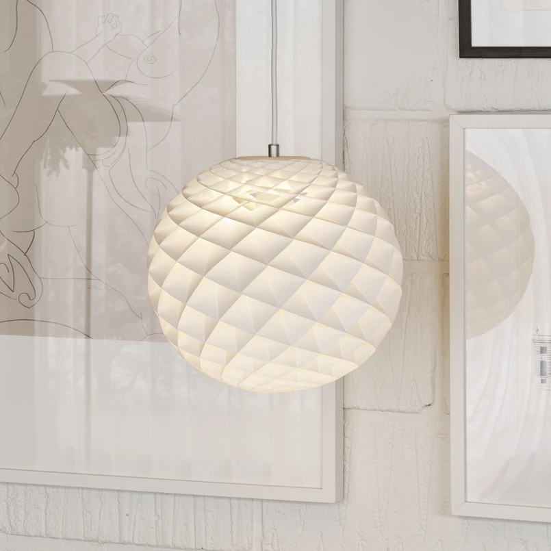Die Pendelleuchte Patera strahlt einen blendfreien Lichtschein ab, der von den kleinen rautenförmigen Zellen reflektiert wird, aus denen sich die Leuchte zusammensetzt. Durch die Struktur wird sichergestellt, dass das Licht ab einem Blickwinkel von 45° blendfrei an die Umgebung gestrahlt wird. Gleichzeitig gibt die Leuchte nach unten gerichtetes Licht sowie einen Lichtschein nach oben ab, der die Decke beleuchtet und so die Umgebung in eine angenehme Atmosphäre taucht. Jede einzelne Zelle verleiht dem Licht Form. Es entstehen sanfte Übergänge zwischen direktem und reflektiertem Licht, wodurch die bemerkenswerte Strahlkraft der kugelförmigen Leuchte besonders betont wird.
