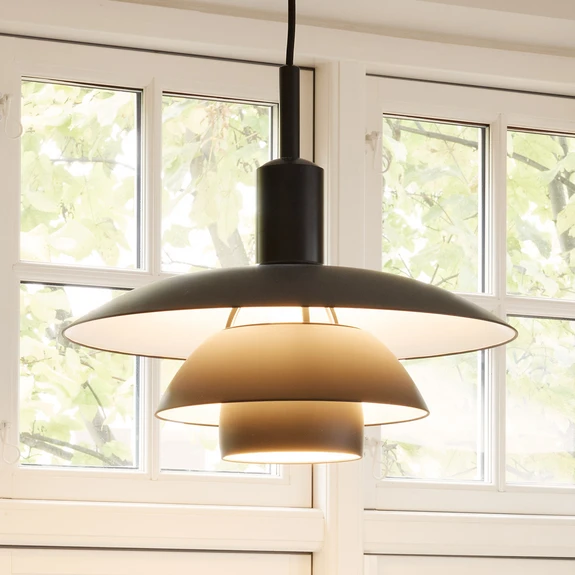 Die LED-Hängeleuchte PH 5/5 besticht durch ihren außergewöhnlichen Schirm, der dreilagig gestaltet ist. Das obere Element wurde aus schwarzem Aluminium hergestellt, während die beiden kleineren Bestandteile aus weißem Opalglas gefertigt wurden und lichtdurchlässig sind. So entsteht ein schöner Lichtschein rund um die Leuchte, der diffus und blendfrei in den Raum strahlt. Besonders gut kommt die Pendellampe über dem Wohn- oder Esszimmertisch zur Geltung. Mit einem externen Dimmer (Mains Dimm) ist es möglich, die Helligkeit der Leuchte anzupassen.
