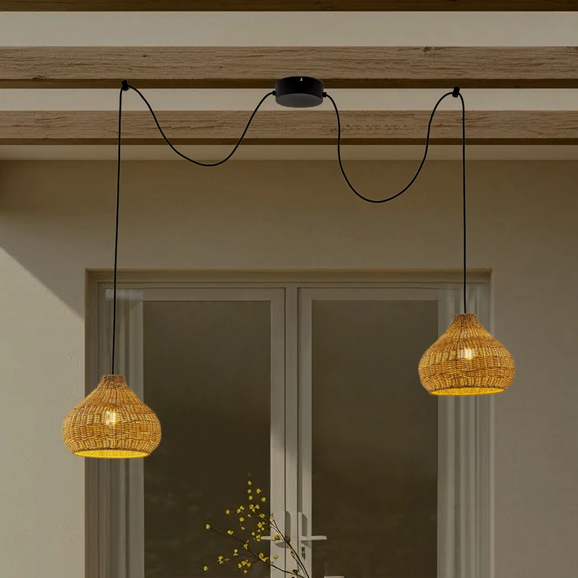 Außenhängeleuchte Taniola mit zwei Leuchtenschirmen aus Rattan