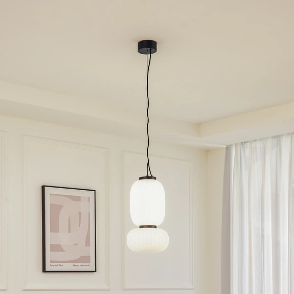 Die LED-Hängeleuchte vereint elegantes Design mit funktionaler Beleuchtung und schafft eine Atmosphäre, die sowohl beruhigend als auch anregend wirken kann. Mit zwei weißen Glasschirmen, die das Licht sanft streuen, ist diese Leuchte eine ideale Wahl für Wohn- und Esszimmer, wo sie eine warme und einladende Umgebung schafft.