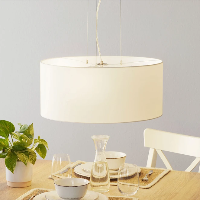 In Räumen wie dem Wohn- oder Schlafzimmer ist eine behagliche Atmosphäre wünschenswert, die zum Verweilen einlädt. Die Hängeleuchte Patrik stellt mit ihrem trommelförmigen Schirm aus Textil ein ideales Beleuchtungsobjekt für ebendiese Räumlichkeiten dar und wertet sie zusätzlich mit ihrem klassisch-eleganten Design optisch auf. Zudem sorgt sie mit drei E27-Fassungen für eine helle Beleuchtung des Raumes, die jedoch durch den Textilschirm keineswegs in den Augen blendet. Die entsprechenden Leuchtmittel können im Zubehör der Leuchte erworben werden.