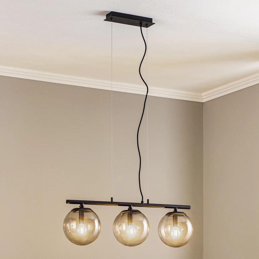 Sotiana eignet sich wunderbar für die Beleuchtung einer Tischfläche und kann gut im Ess- oder Wohnzimmer zum Einsatz kommen und dort ein angemessen helles Licht spenden. Dank der klaren Oberfläche der Rauchglasschirme geht kaum Licht aus dem Inneren verloren und die Leuchtmittel sind zu jeder Zeit gut sichtbar. Daher sollten sie auch optisch passend ausgewählt werden und im Idealfall die schöne Filamentoptik aufweisen, wie man sie heutzutage von vielen LED-Leuchtmitteln kennt, die besonders sparsam im Verbrauch sind. Das Design der Hängeleuchte mutet geradlinig an, besitzt aber durch die Kugelschirme aus Glas auch einen Hauch Luxus, der die stilvolle Gestaltung in Wohnräumen wunderbar ergänzt. Man kann davon ausgehen, dass das Design eine Neuinterpretation einer klassischen Gestaltungsweise ist und somit Vintagequalitäten mit einer zeitgemäßen Gestaltung verbindet. Das Leuchtengestell ist ganz in Schwarz gehalten und es harmoniert wunderbar mit der grauen Tönung der Glaskugeln.