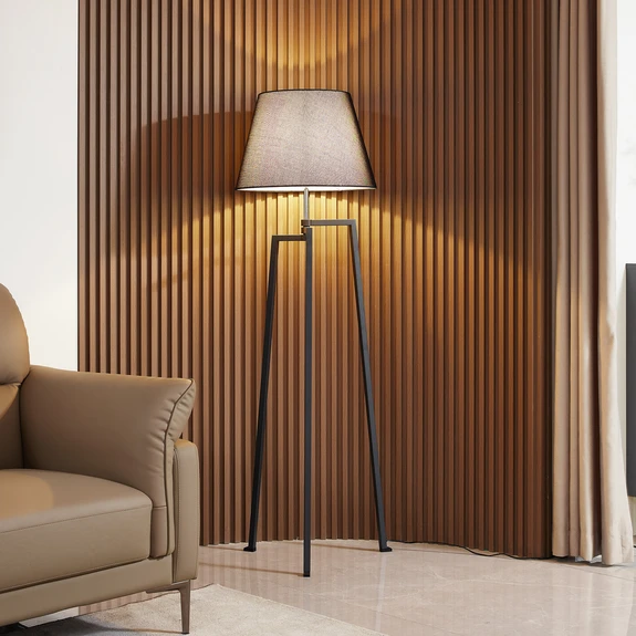 Die Justierbarkeit der drei Beine mithilfe der Gelenke ermöglicht eine individuelle Anpassung an die Umgebung. Durch den textilen, dunklen Schirm gelangt ein sehr gedämpftes, blendfreies Licht in den Raum, das für Gemütlichkeit sorgt.