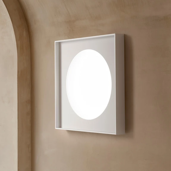 LED-Wandleuchte Cassette mit quadratischem Rahmen und rundem, flächigem Lichtaustritt
