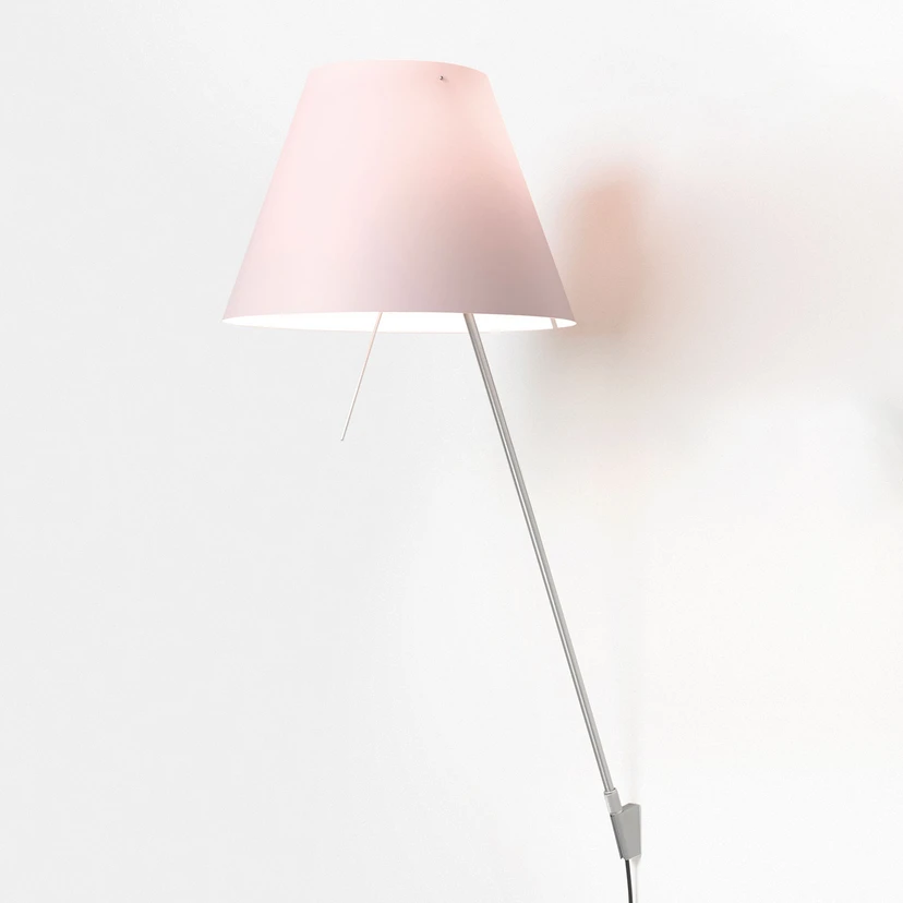 Das Gestänge der Wandleuchte besteht aus Aluminium und wird von einem Schirm aus Polycarbonat ergänzt. Grundsätzlich wurde bei einer klassischen Leuchte wie dieser auf jegliche störende Details verzichtet - mit einer Ausnahme: Der Stab am unteren Ende des Schirms ist eine praktische und zugleich stilvolle Neuinterpretation eines Ein- und Ausschalters.