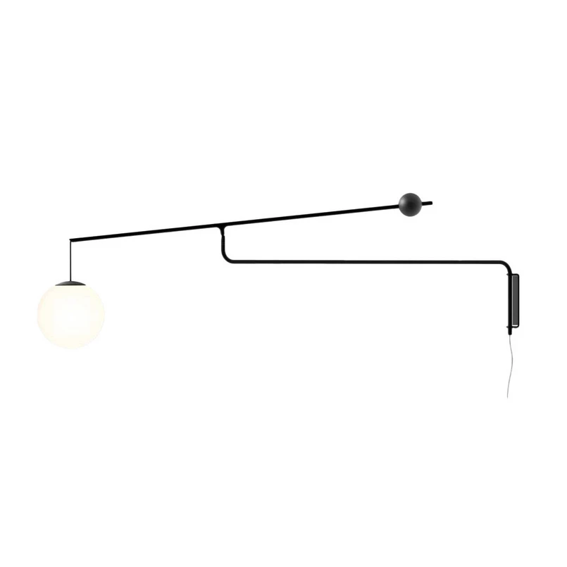 Zwei schmale Gelenkarme aus Stahl und ein runder Diffusor aus opalweißem Glas prägen das Erscheinungsbild der Wandleuchte Malamata. Mit Hilfe des am äußeren Arm angebrachten Gegengewichts, das sich verschieben lässt, kann die Neigung des Arms und somit die Position des Kugelschirms beliebig nach oben und unten verstellt werden. Das Freigeben und Arretieren des Gewichts erfolgt über einen Druckknopf, der eine Feder spannt.