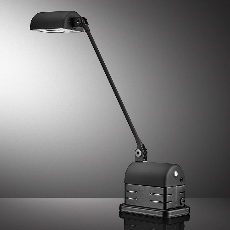 Im Anschluss folgt der verstellbare Arm, der sich um 180° von der Waagrechten, über die Senkrechte bis zur entgegengesetzten Seite schwenken lässt. Über ein Gelenk ist der unverwechselbare Leuchtenkopf mit halbzylindrischem 8-Loch-Diffusor verbunden, der das charakteristische Element der gesamten Daphine-Familie darstellt. Der Kopf ist um 360° drehbar sowie um 200° nach oben und unten kippbar.