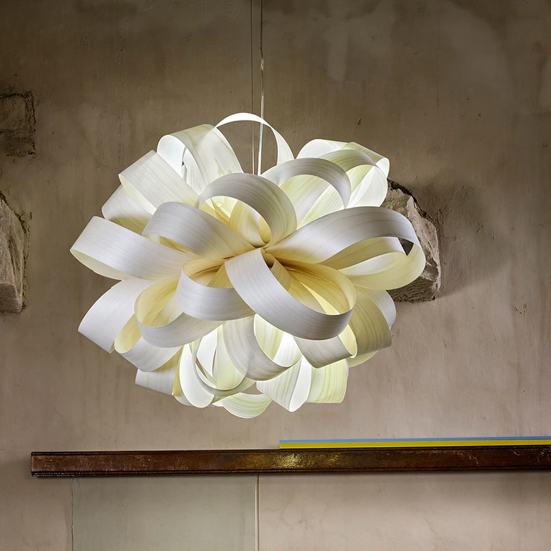 Die Pendelleuchte Agatha Ball vermittelt mit ihren zahlreichen Schleifen aus dünnem Holzfurnier den luftig-leichten Eindruck einer in voller Blüte stehenden Blume. Sie entsteht in der eigenen, patentierten Timberlite®-Technik des Herstellers LZF. Das Ergebnis ist ein elastisches Furnier von besonders geringer Stärke, das leicht transluzent ist, sodass die Maserung des Holzes bei eingeschaltetem Licht hervorgehoben wird und den Raum mit seiner natürlichen Schönheit erfüllt. Dieses Schmuckstück eignet sich nicht nur für die stilvolle und einzigartige Beleuchtung von Restaurants, Cafés und trendigen Szenebars, sondern auch für die eigenen vier Wände.