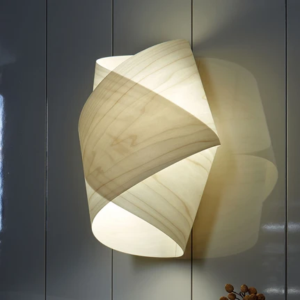 Die Wandlampe Orbit in kompakter, ovaler Grundform scheint nur aus einem breiten, in der Mitte übereinander geschwungenen Band zu bestehen. So entsteht ein beeindruckendes Lichtbild: Nach oben und unten kann das Licht frei austreten, während zur Front und seitlich das Licht dezent durch das dünne Holz dringt und dessen Maserung betont. Das transluzente, elastische Furnier entsteht in der hauseigenen Technologie des Herstellers LZF-Lamps. Mit der natürlichen und blendfreien Beleuchtung eignet sich Orbit gut für das Wohnzimmer und auch als Wandlampe neben dem Bett.