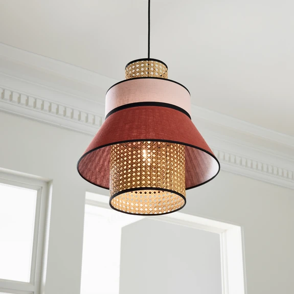 Leicht asiatisches Flair verbreitet die Hängeleuchte Singapour ML, worauf der Name bereits hindeutet. Der Schirm wird aus insgesamt vier Elementen - zwei konischen Rattanschirmen sowie zwei verschiedenfarbigen Stoffschirmen aus gewaschenem Leinen - gebildet. Mit dem Einschalten des Lichts tritt das Rattanmuster dann auch unter dem unteren Leinenschirm hervor und erzeugt eine stimmungsvolle Lichtwirkung, die für ein sehr behagliches Ambiente sorgt. Eine Hängeleuchte, die an jedem Platz in der Wohnung, sei es als Allgemeinbeleuchtung oder über einem Tisch hängend, eine angenehme Ausleuchtung bietet.