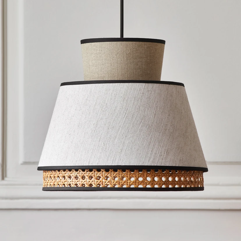 Drei Schirme besitzt die Hängelampe Singapour: Den unteren Rand bildet ein Schirm aus naturbelassenem Rattangeflecht. Darüber sind zwei Schirme aus gewaschenem Leinenstoff drapiert, wobei der kleinere Schirm den oberen Abschluss bildet. Sobald die Beleuchtung eingeschaltet wird, kommt die Unterschiedlichkeit der Materialien und Farben erst optimal zur Geltung und das Rattangeflecht zeichnet sich etwas unter dem Leinenstoff ab. Eine tolle Hängeleuchte für die Allgemein- oder Bereichsbeleuchtung, die sich zudem über einen externen Dimmer in der Helligkeit regulieren lässt.