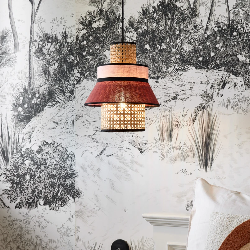 Diese Hängeleuchte bietet bereits ohne Beleuchtung einen sehr ästhetischen Anblick. Singapour XML besteht aus insgesamt vier Schirmen, davon wurden die beiden inneren Schirme unterschiedlich groß in konischer Form aus Rattan gearbeitet. Über den beiden verbundenen Schirmen sitzt noch ein zweiteiliger Leinenschirm, dessen beide Elemente sich ebenfalls in der Größe und dazu noch in der Farbgebung unterscheiden. Der kleinere der beiden Stoffschirme ist nach oben gerichtet, ebenso wie sich der kleinere der beiden Rattanschirme an der Oberseite befindet. Sobald das Licht eingeschaltet wird, wird das Rattanmuster durch den Stoff sichtbar. Eine auffällige, elegante Hängeleuchte, die mit vielen Wohnstilen harmoniert und ein Stück Natürlichkeit in den Raum bringt.