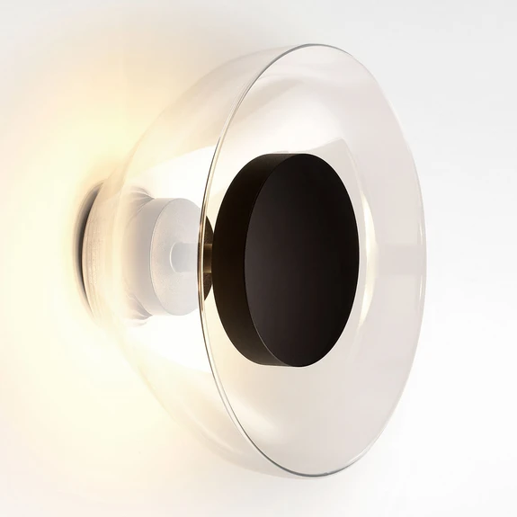 Schnörkellos und dennoch dekorativ präsentiert sich Aura, deren halbrunder Schirm aus geblasenem Glas gefertigt wird. Er ist lichtdurchlässig gestaltet, wodurch das warmweiße Licht der integrierten LEDs seitlich in den Raum verteilt wird. Sie sorgt aber auch im ausgeschalteten Zustand für ansprechende Akzente und überzeugt mit ihrem markanten Design. In dem runden Schirm ist mittig eine kreisförmige Aluminiumplatte integriert, die das Licht in Richtung Wand abstrahlt und so eine indirekte Lichtwirkung erzielt, bei der jegliche Blendung vermieden wird. Dadurch entsteht eine angenehme Raumbeleuchtung.