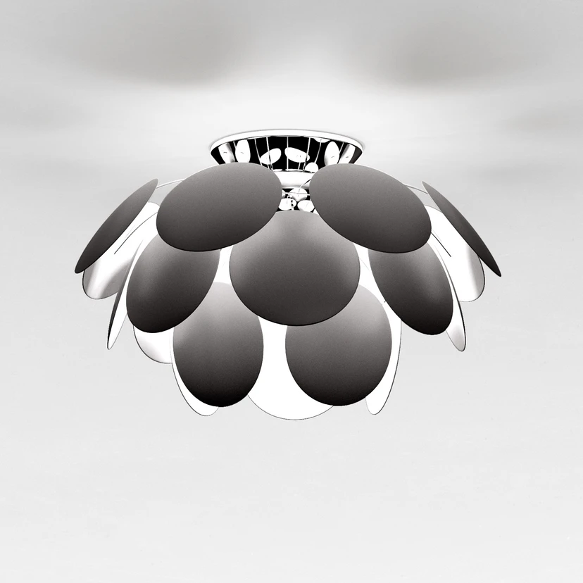 Mit der Design-Deckenleuchte Discocó zieht nicht nur ein dekoratives Einrichtungsaccessoire in Wohn- und Schlafräume sowie Flure und Dielen ein, sondern auch ein fantastisches Lichtspiel. Von einer verchromten Metall-Halbkugel aus erstrecken sich scheibenförmige Elemente aus ABS-Kunststoff in den Raum. Das Licht der eingesetzten Leuchtmittel bewirkt einerseits ein abwechslungsreiches Spiel aus Licht und Schatten und sorgt andererseits beim Auftreffen auf die verchromte Halbkugel aus Metall für wundervolle Reflexionen.