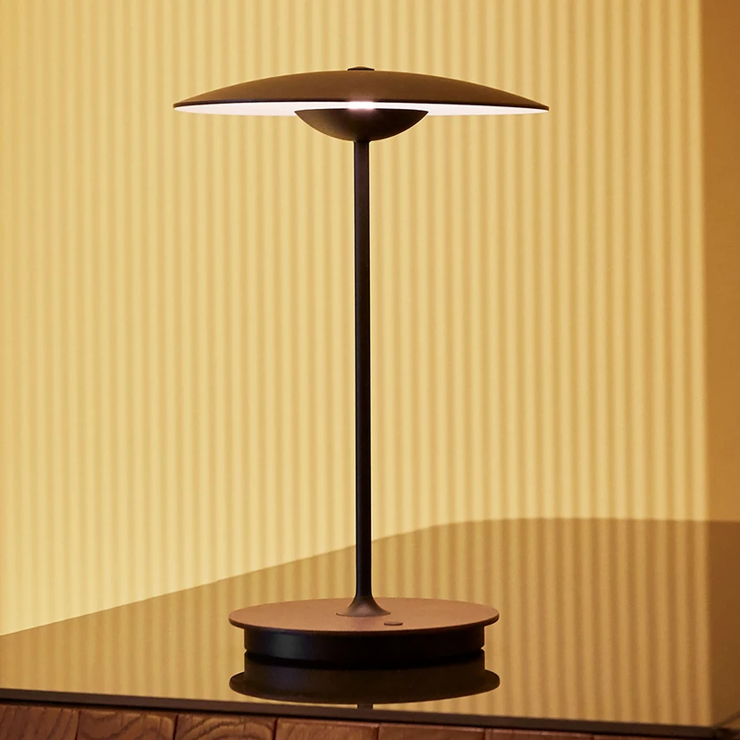 Die LED-Tischleuchte Ginger ist dank ihres integrierten Akkus, der sich mühelos über ein USB-Kabel aufladen lässt, ein portables Beleuchtungsobjekt, das seinen Platz auf jeglichen Tischen im privaten und öffentlichen Bereich findet. Sie sorgt für ein diffuses, blendfreies Licht, das auf angenehme Weise nach unten gestreut wird. Durch den 3-Stufen-Dimmer lässt sich zusätzlich die Helligkeit regulieren. Ein dezenter, schwarzer Wärmeableiter aus Aluminium ist unterhalb des flachen, halbrunden Schirmes positioniert und reflektiert das warmweiße Licht der LEDs nach oben gegen die Innenseite des Schirmes.