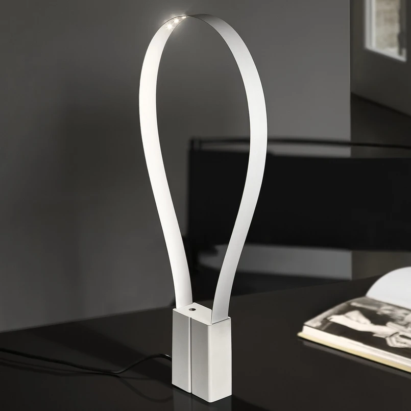 Diese weiße Tischleuchte setzt das Konzept eines LED-Strips als Tischleuchte um. Fluida besteht aus einem biegsamen und drehbaren Streifen, der im mittleren Abschnitt zu einer Seite mit LEDs besetzt ist. An den Enden dient je ein Quader aus Gießharz als Sockel. Hier sind Magnete integriert, sodass die Blöcke in beliebiger Position miteinander verbunden werden können. Dies lässt zahlreiche kreative Optionen zur Gestaltung als weiter Bogen oder schmale Schlaufe zu.