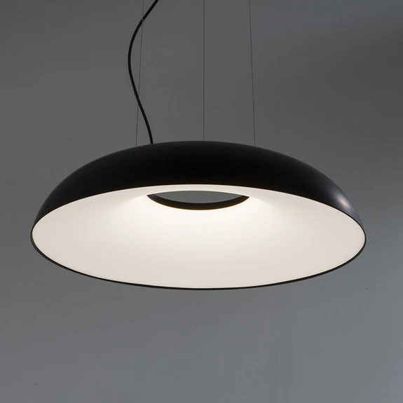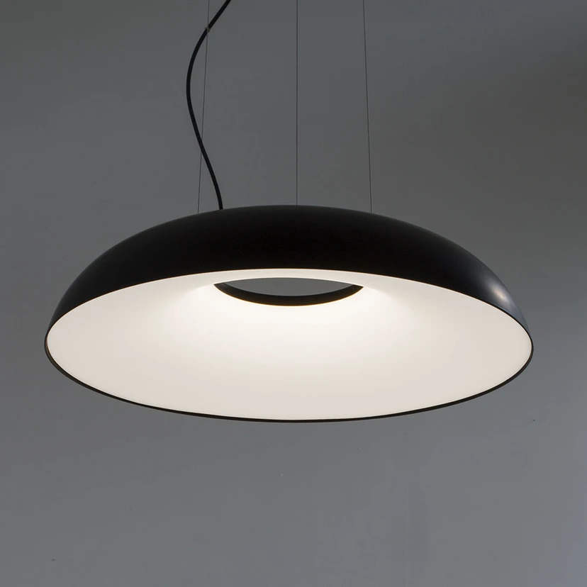 Diese Hängeleuchte vereint aufgeräumte Formgebung und angenehmes Licht und ist damit eine hervorragende Wahl zur Tisch- oder Bereichsbeleuchtung in modern eingerichteten Wohn- und Aufenthaltsräumen. Die Struktur des Schirms ist als leicht gewölbte Haube mit zentralem Ausschnitt geformt und besteht aus farbig lackiertem Aluminium. Die gesamte Innenseite nimmt der Diffusor aus opalem Methacrylat ein, der das Licht der integrierten LEDs gleichmäßig streut und für eine breite, diffuse Ausleuchtung der unterhalb gelegenen Fläche sorgt. Der Lichtoutput kann optional über eine externe DALI/Push-Steuerung geregelt werden.