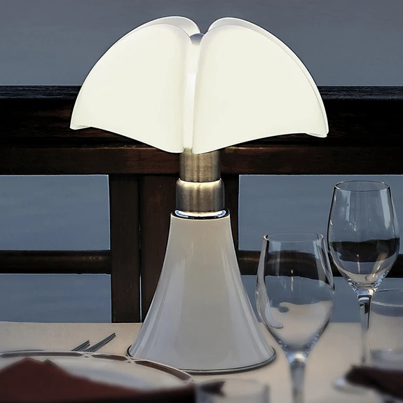 Diese Tischleuchte zählt zur Serie Pipistrello, die von der italienischen Architektin und Designerin Gaetana „Gae“ Aulenti (1927 - 2012) bereits 1965 entworfen wurde und damals wie heute vom Hersteller Martinelli Luce produziert wird. Wie der Name erahnen lässt, handelt es sich bei Minipipistrello um eine kleinere Ausführung. Auf die handlichen Abmessungen ist auch die Technik abgestimmt. So kann die LED-Tischleuchte auch an Orten ohne Stromanschluss platziert und dort betrieben werden, denn sie ist mit einem Akku ausgestattet (Ladekabel USB zu Micro-USB liegt bei). Die Bedienung erfolgt über den am Fuß integrierten Schalter, der gleichzeitig als Touchdimmer dient.