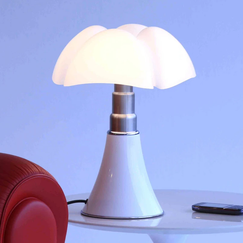 Die Tischleuchte Minipipistrello ("kleine Fledermaus") ist ein absolutes Kunstobjekt, denn ihr viergliedriger, opalweißer Leuchtenschirm aus Methacrylat erinnert in der Tat ein wenig an ausgebreitete Fledermausflügel. Auch ihr teleskopähnlich geformter Leuchtenfuß aus hochwertigem Edelstahl macht die Leuchte zu einem unübersehbaren Highlight im Wohnraum. Das Licht wird durch den opalen Schirm diffus und blendfrei ausgestrahlt, wodurch eine angenehme Lichtatmosphäre entsteht.