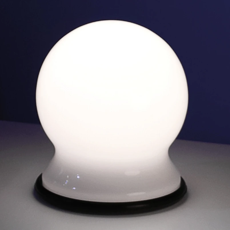 Das diffuse Licht der Tischleuchte Scafandro entsteht in ihrem Inneren und wird durch den Glasschirm, der sich wie eine Blase aus weiß eingefärbtem Glas um die Lichtquelle legt, gedämpft. So scheint die gesamte rundliche Glasstruktur zu leuchten, was nicht nur den Raum erhellt, sondern auch ein optisches Highlight auf dem Nachttisch oder einem Sideboard ergibt. Der schwarze Fuß der Leuchte besteht aus Gummi und gibt ihr so einen festen Stand auch auf glatten Oberflächen.
