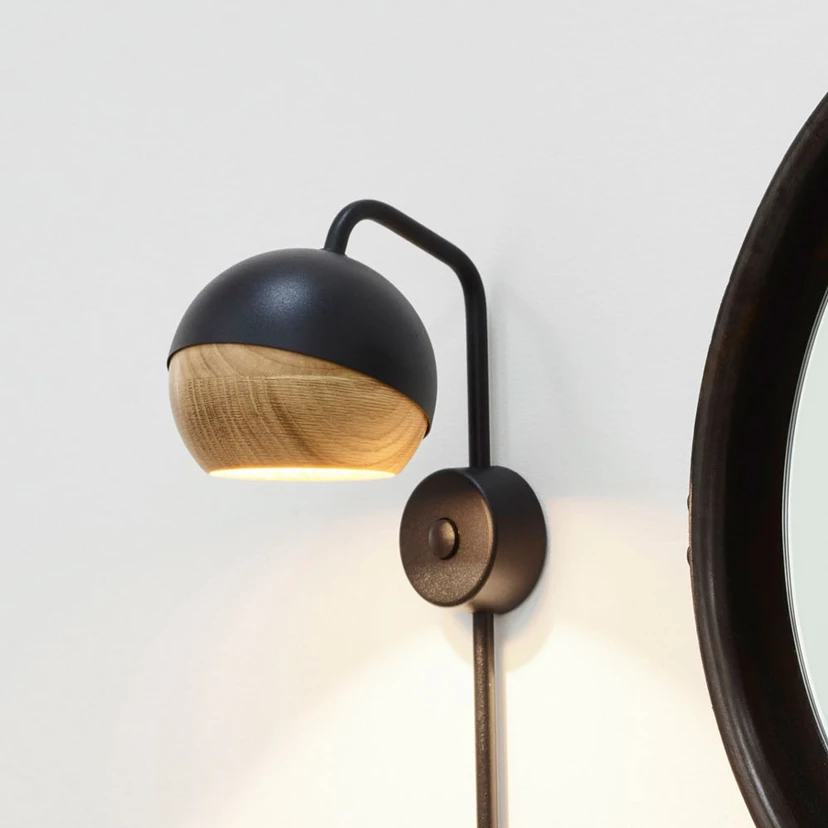Diese Wandleuchte unterstreicht mit ihrem skandinavisch-minimalistischen Design wirkungsvoll einen modernen, natürlich inspirierten Einrichtungsstil. Ray ist mit einem Kugelschirm ausgestattet, der sich aus einer lackierten Stahlhaube und einer im Innern magnetisch befestigten Sphäre aus Eichenholz zusammensetzt. Mit einem drehen des Holzelements lässt sich die runde Lichtöffnung auf den gewünschten Bereich richten. Der Ein-/Aus-Schalter befindet sich an der Montageschiene, zur Stromversorgung kann die Wandleuchte dank ihres Steckerkabels direkt an eine Steckdose angeschlossen werden.