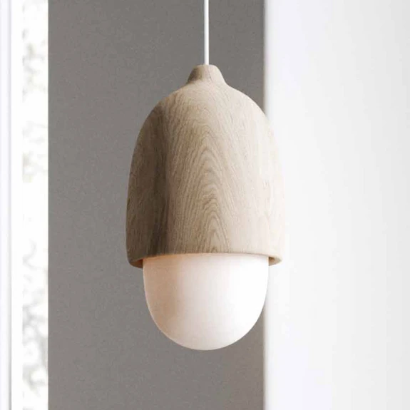 Der Name "Terho" dieser Hängeleuchte ist das finnische Wort für "Eichel"; wie eine Frucht des Eichenbaums ist der Schirm der Pendelleuchte geformt. Er setzt sich aus einer Kappe aus Lindenholz und einem opalen Diffusor aus handgeblasenem Glas zusammen. Terho wirkt auch ausgeschaltet als stilvolles Einrichtungselement und sorgt bei eingeschaltetem Licht für eine sanfte,Allgemein- oder Tischbeleuchtung.