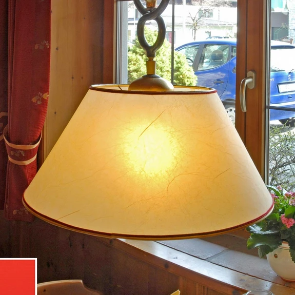 Die Hängeleuchte Provence Chalet gefällt durch ihren klassisch gehaltenen Kunststoff-Leuchtenschirm. Er ist wahlweise in Gelb oder einem eleganten Rot erhältlich. Das Strichlackverfahren verleiht ein warmes Farbambiente. Rustikal wirkt die Hängeleuchte durch