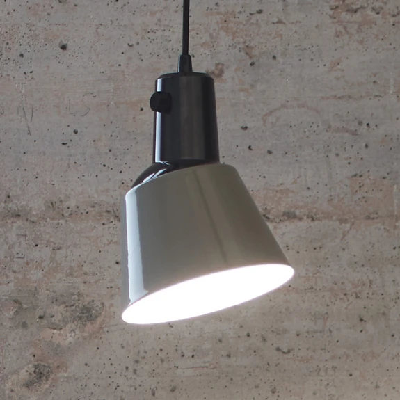 Der Schirm ist ein nach unten offener Kegelstumpf aus Metall, welcher am oberen Dom aus schwarzem Bakelit gedreht werden kann. Der Lichtkegel lässt sich so je nach Bedarf ausrichten, beispielsweise zur linken oder rechten Seite eines langen Tischs. Hinzu kommt ein Drehschalter, der eine sofortige Bedienung direkt an der Leuchte ermöglicht, ohne dass hierzu der Gang zum Wandschalter erforderlich ist. Das externe Schalten und Dimmen ist (bei eingeschaltetem Schalter an der Leuchte) weiterhin möglich. Die Aufhängung setzt sich aus einem Textilkabel und einem runden Stahlbaldachin in Schwarz zusammen.
