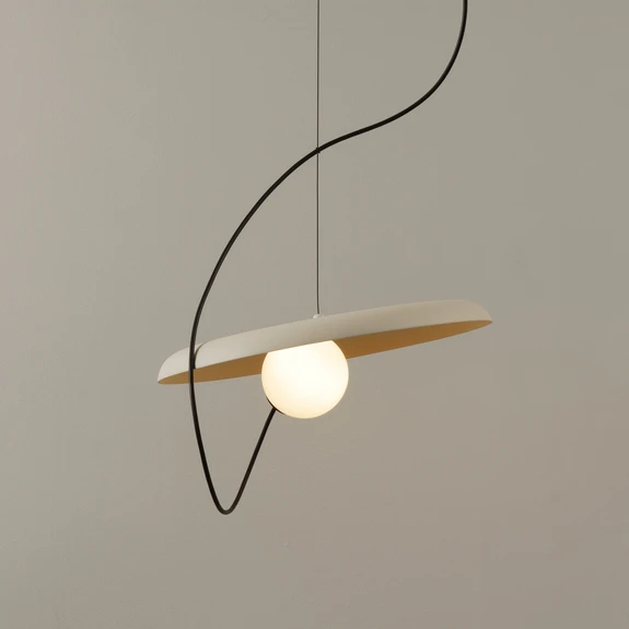 Bei der Premiumleuchten-Serie Wire werden herkömmliche Leuchtenbestandteile neu interpretiert und spielerisch zusammengesetzt. Statt das Stromkabel verstecken zu wollen, spielt es hier eine entscheidende Rolle, wie der englische Begriff Wire bereits vermuten lässt. Die Hängeleuchte hängt in zwei Teilen vom Baldachin ab. Ein flacher Schirm aus Stahl hängt von einem senkrechten Draht ab, ein kugelförmiger Diffusor aus opalweißem, mundgeblasenem Glas ist an einer etwas längeren Zuleitung befestigt. Die Zusammenführung ist dank integriertem Neodym-Magnet veränderbar. Die Kugel kann an einer beliebigen Stelle auf dem Schirm platziert werden und ist durch den Filzstoff vor Kratzern geschützt.