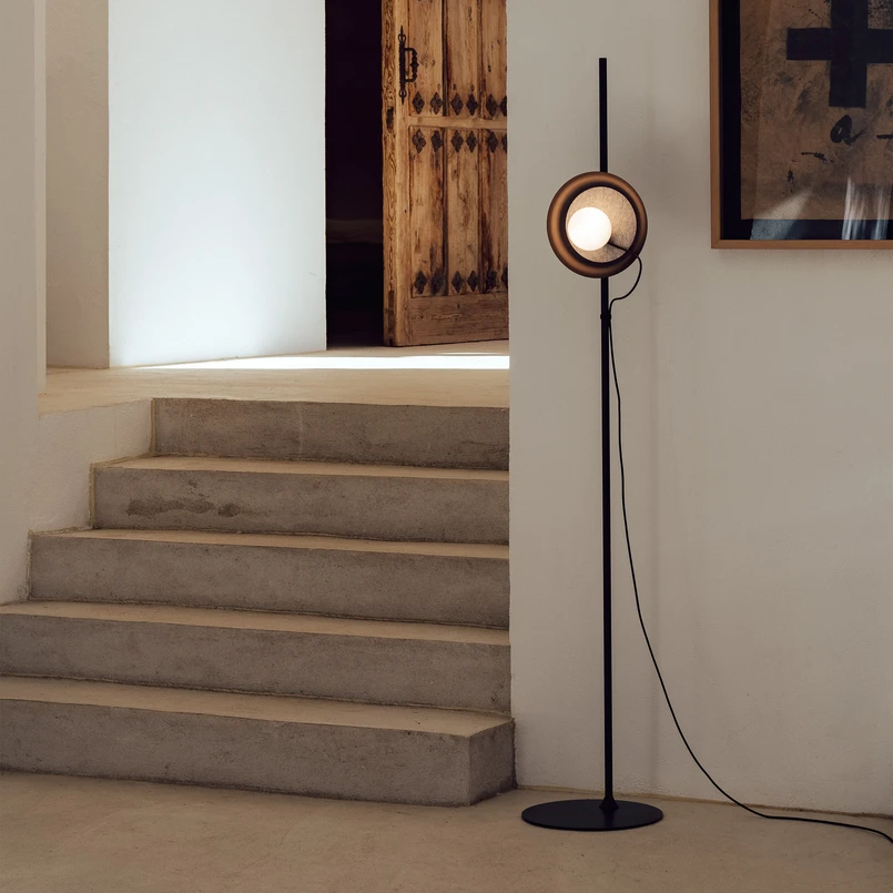 Das Konzept von Wire lädt zur Interaktion ein und lässt sich dabei in verschiedenste Positionen bringen, um die Optik und Funktionalität an die eigenen Vorlieben und Gegebenheiten vor Ort anzupassen. Zum einen lässt sich der gesamte Schirm der Stehleuchte auf beliebiger Höhe am Gestell befestigen. Zum anderen sind auch die Bestandteile des Schirms nicht starr. Eine Schale aus Stahl und eine mundgeblasene Glaskugel bilden zusammen den unkonventionellen Lampenschirm. Der opalweiße Diffusor verbirgt nicht nur die Fassung für das Leuchtmittel, sondern auch einen kugelförmigen Neodym-Magneten. Dieser ermöglicht es, die Lichtquelle immer wieder neu positionieren zu können. Der Filz dazwischen verhindert Rückstände in Form von Kratzern. Ein- und ausgeschaltet wird Wire über einen Fußtrittschalter.