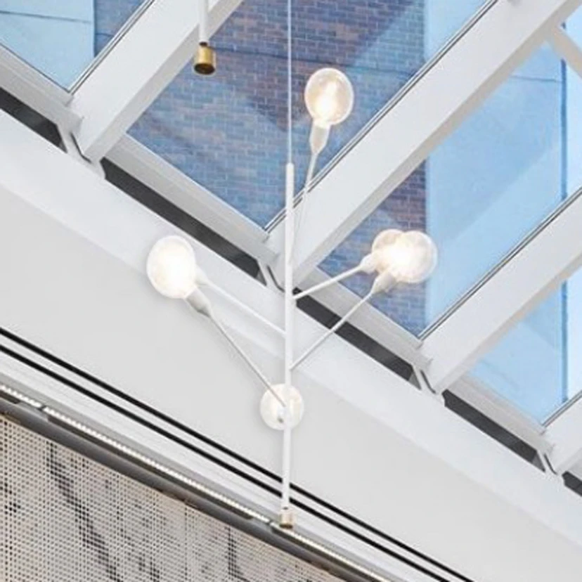 Von der Abhängung in der Mitte, die aus lackiertem Metall gefertigt wurde, erstrecken sich sechs Metall-Leuchtenarme mit Fassungen an den Enden in den Raum. An der unteren Spitze der Abhängung befindet sich ein Gegengewicht aus Messing. Als Leuchtmittel eignen sich besonders gut Globe-Filamentlampen. Die Leuchtmittel werden nicht mitgeliefert, sie können extra über das Zubehör bestellt werden.