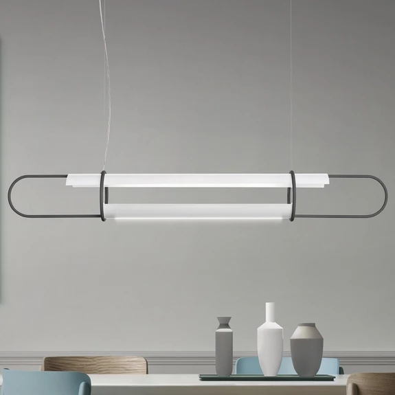 Die LED-Pendellampe Clip 130 fällt einerseits bereits durch ihre Länge auf, andererseits sorgt sie mit ihrem leistungsstarken, sowohl nach oben als auch nach unten strahlenden Licht für Furore. Der längliche, seitlich abgerundete Leuchtenrahmen aus Metall beherbergt zwei weiße Kunststoffdiffusoren, die nicht nur das LED-Licht gezielt nach oben und unten leiten, sondern auch einen großen Anteil am Gesamteindruck des Designs haben.