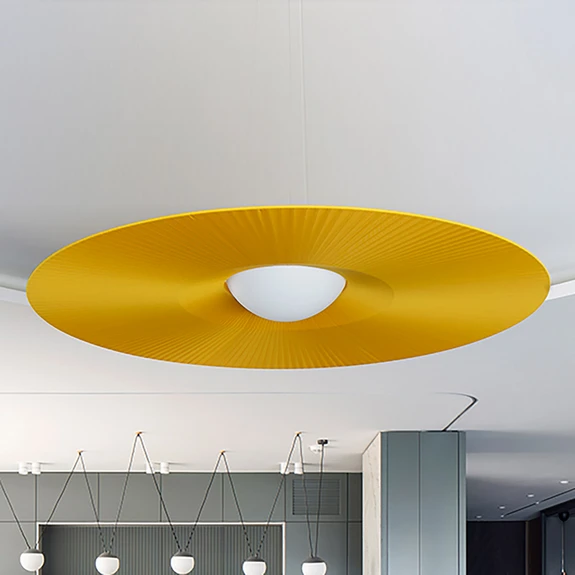 Der Schirm der LED-Hängelampe Mood besteht aus plissierten Stoffbändern, die zu einer Scheibe zusammengefügt wurden, in deren Mitte ein opalweißer Diffusor sitzt, der die LEDs beherbergt und ihr Licht blendfrei an die Umgebung abgibt. Dabei wird auch die Stoffscheibe besonders eindrucksvoll in Szene gesetzt. Eine Hängeleuchte, die aufgrund ihrer optischen sowie lichttechnischen Präsenz vielseitig in privaten Räumen sowie im gastronomischen Bereich und in der Hotellerie eingesetzt werden kann.