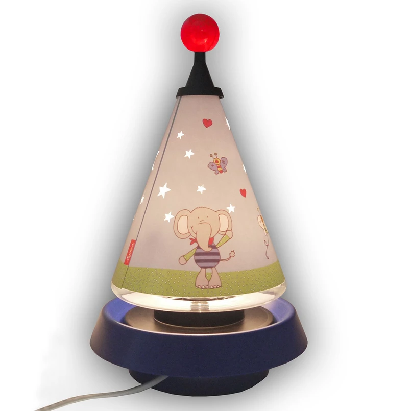 Eine tolle Dekoration im Kinderzimmer ist die Tischleuchte Lolo Lombardo, und zwar sowohl am Tag als auch in der Dunkelheit. Der Schirm der Tischleuchte rotiert dank eines leisen Motors und durch das Licht werden Sterne ringsum an Wände, Möbel und Decke projiziert. Die Tischleuchte wird über den in der Zuleitung integrierten Zwischenschalter ein- und ausgeschaltet und ist mit einem Steckertrafo ausgestattet.