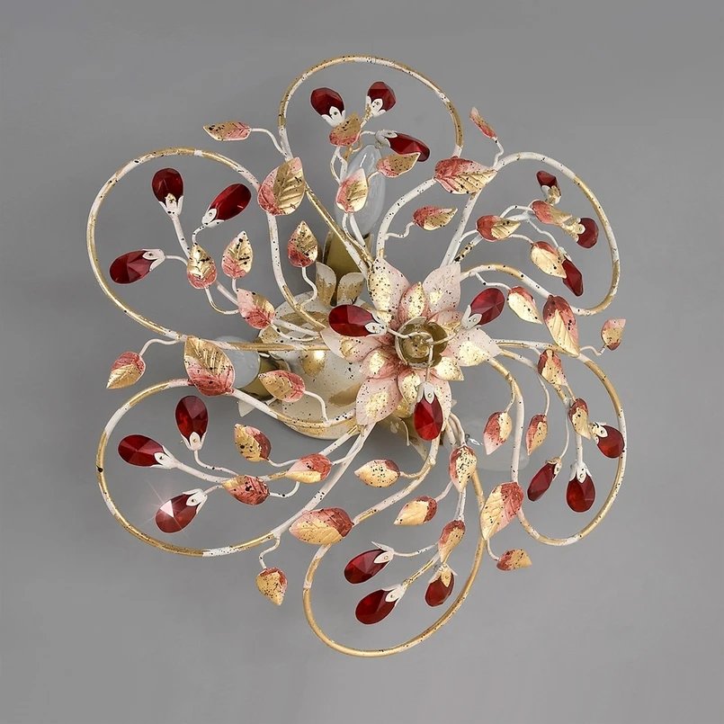 Die Deckenleuchte Nadja gleicht in ausgeschaltetem Zustand eher einer kunstvollen Dekoration als einer Lichtquelle. Wie eine Blume ist ihre Ornamentik geschwungen, einzelne Blätter sind erkennbar und scheinen wie ein Sonnenrad, sobald man das Licht einschaltet. Filigranes weißes Metall bildet das Grundgerüst für die aufwendigen Ornamente in Blattform und für die verschieden gefärbten Leuchtmittel. Die purpurroten, geschliffenen Kristalle lassen das Licht im Raum dann fast ein wenig unwirklich erscheinen. Die toskanische Manufaktur, die sich für dieses Schmuckstück verantwortlich zeigt, hat der Romantik und Gestaltungsfreude mit dieser Deckenleuchte ihren freien Lauf gelassen und hat ein Objekt geschaffen, welches die Lichtgestaltung im Raum absolut einzigartig werden lässt. In dieser Atmosphäre darf man noch träumen!
