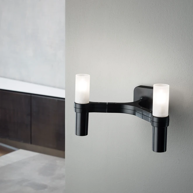 Mit ihrer aus Aluminium gefertigten, symmetrischen Struktur, die wie der Abschnitt eines Moleküls erscheint, spricht die Wandleuchte Crown eine moderne Formensprache. Die beiden Leuchtmittel werden innerhalb nach oben orientierter, opaler Glaszylinder eingesetzt; letztere sorgen für eine angenehm gleichmäßige Lichtabgabe zu allen Seiten.