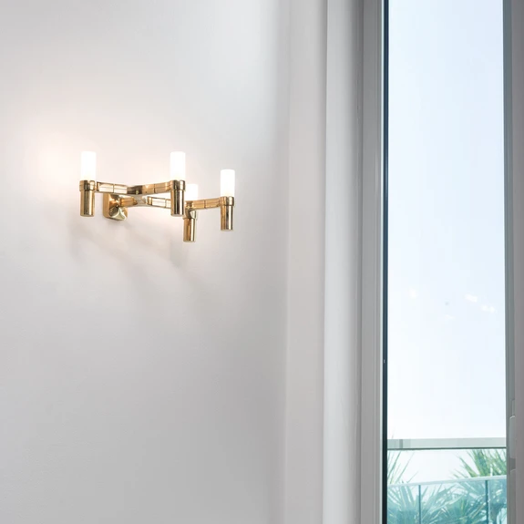 Mit ihrer markanten Aluminium-Struktur fällt die Wandleuchte Crown sofort ins Auge. Vier Fortsätze in der Anordnung eines Halbkreises tragen je eine Fassung. Die jeweils einzusetzende Lampe wird von einer zylindrischen Abdeckung aus opalem Glas umschlossen, sodass das Licht gleichmäßig die umliegende Wand und den Raum erhellt und die besondere Form der Leuchte betont.
