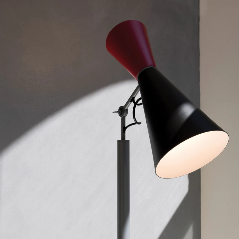 Die Gestaltung des Kopfs mit zwei gegensätzlich orientierten Kegel-Schirmen in unterschiedlichen Farben ist nicht nur optisch auffällig, sondern auch funktional durchdacht; so wird direkte und indirekte Beleuchtung zugleich ermöglicht. Diese kann je nach Wunsch ausgerichtet werden, denn der Kopf ist einerseits horizontal drehbar und andererseits vertikal um 180° kippbar, sodass das Licht zu den Seiten oder nach oben/unten ausgestrahlt wird. Auf dem Steckerkabel befindet sich eine Bedieneinheit mit Schalter und Schieberegler zum Dimmen.